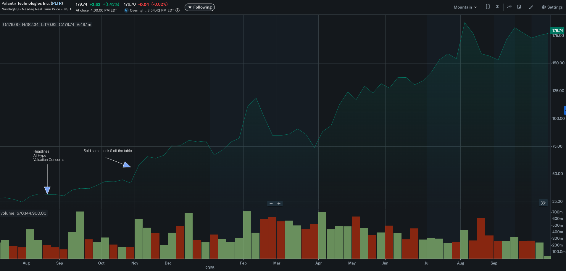 Take Palantir ($PLTR) for instance. It was trading around $20–$30 per share just two summers ago — July/August 2024. I remember the headlines screaming “Valuation Concerns” and “AI Hype.” By early fall, I trimmed that position to lower the portfolio risk. Fast-forward a year, and the stock has defied the skeptics — proving that narratives often lag reality.