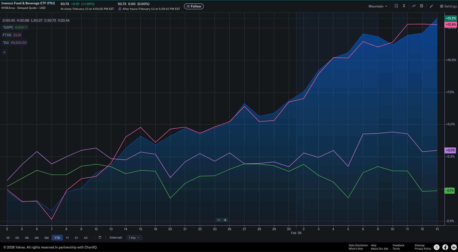 Year-to-Date $PBJ and $FTXG are up 12–13%, compared to the S&P 500 that is flat and the DOW that’s up a modest +3.0%.